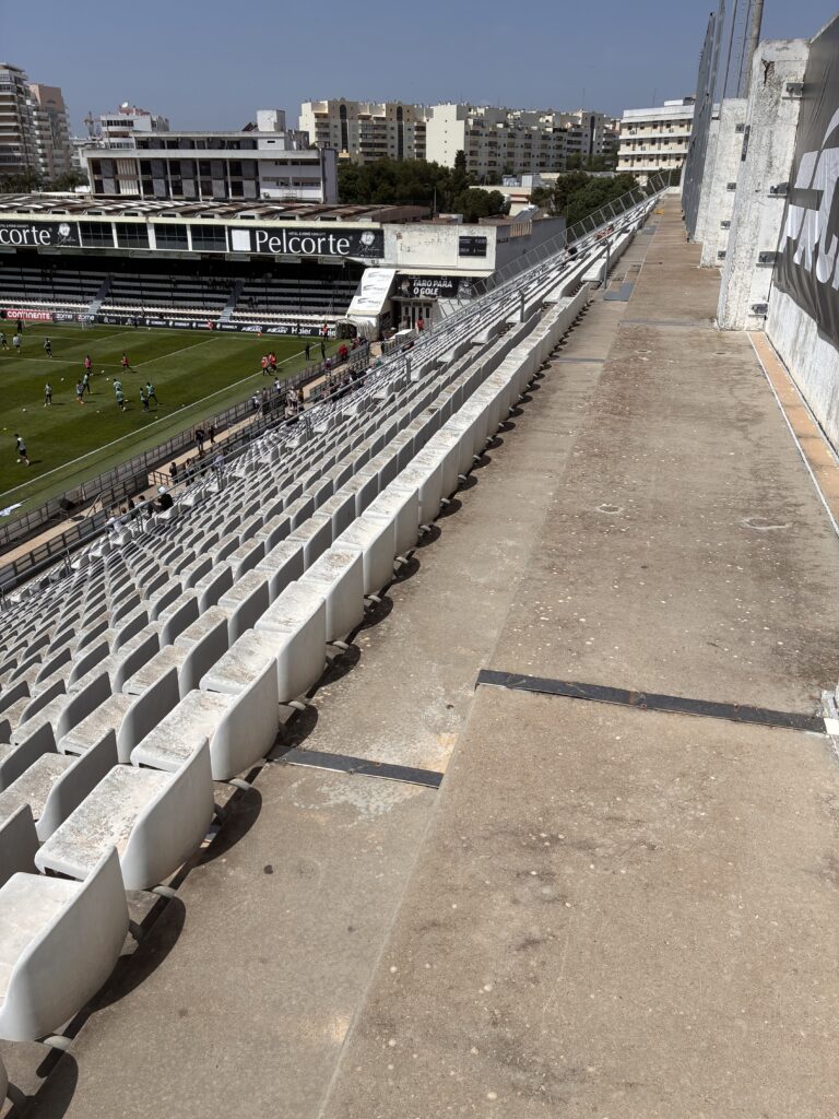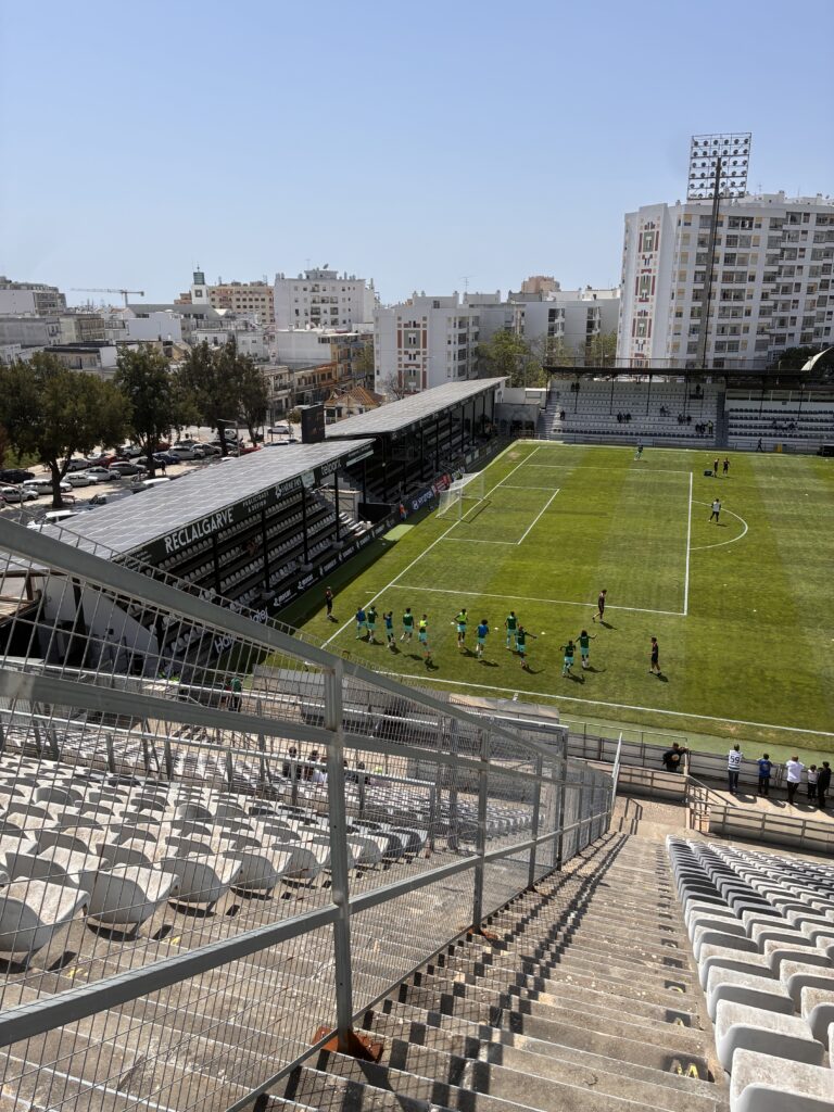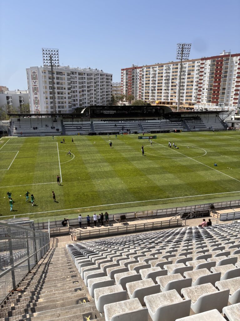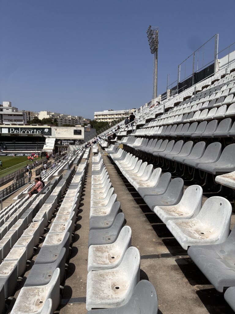 Zurück im Hier und Jetzt. Vor mir am Kartenhäuschen kauft eine englische Familie Tickets. Überhaupt sieht man viele Engländer im Stadion; die Algarve ist komplett auf die Insel eingestellt. In den Hotspots läuft englischer Fußball in den Bars, es gibt englisches Frühstück und alles ist zweisprachig. Obwohl es 2. Liga ist, wird man am Eingang professionell gefilzt, Tickets gescannt, überall Security. Man fragt sich, wie sich das bei einem Schnitt von 1.855 Zuschauern rechnet. Viel mehr dürften es auch an diesem Tag nicht gewesen sein – darunter aber auffallend viele in Trikots von Sporting.